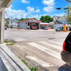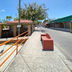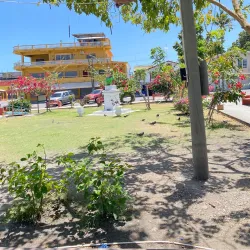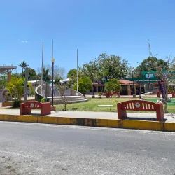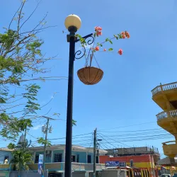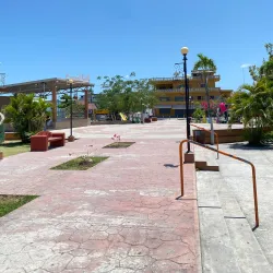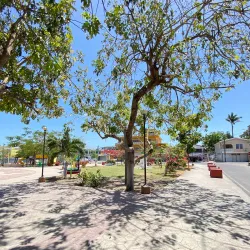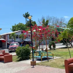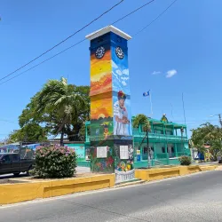 The central park in Orange Walk Town is a community gathering spot surrounded by shops, cafes, and local businesses.