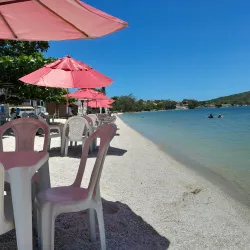 The beach is lined with local restaurants and bars where visitors can enjoy fresh seafood and traditional Brazilian dishes while taking in views of the lagoon and surrounding hills.