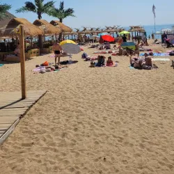 The beach is well-equipped with amenities including sun loungers, umbrellas, and beach bars, making it a perfect spot for relaxation and socializing.