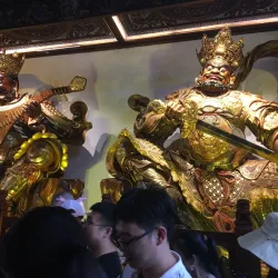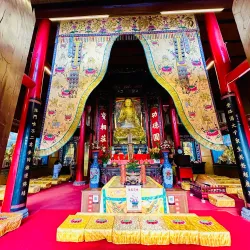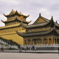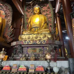The temple complex includes ancient halls, statues, and beautiful gardens, reflecting traditional Chinese religious architecture.