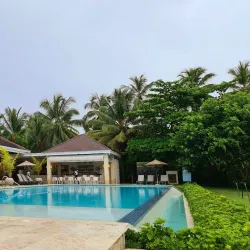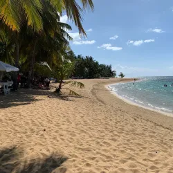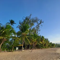 The beach is surrounded by coconut palms and is a favorite among locals for weekend outings.