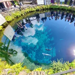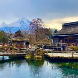 Oshino Hakkai is a set of eight clear ponds fed by the melted snow from Mount Fuji. The ponds are known for their crystal-clear water and scenic beauty, surrounded by traditional thatched-roof houses.