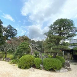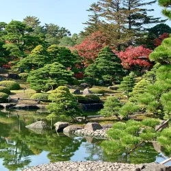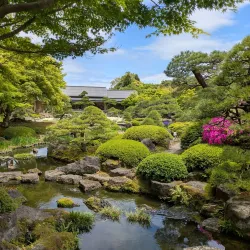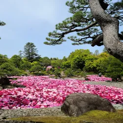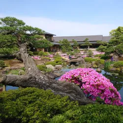 Yushien Garden is a traditional Japanese garden known for its seasonal flowers, including azaleas and hydrangeas.