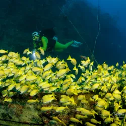 The wreck is surrounded by vibrant coral reefs and a variety of fish species, offering an exciting experience for advanced divers.