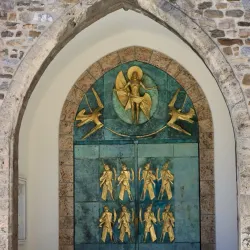 The church features stained glass windows and art that reflect the town's religious history.