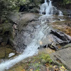 The waterfall offers a refreshing natural setting and is surrounded by lush greenery.