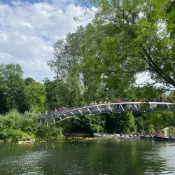The island is accessible via footbridges and offers scenic views of the river and surrounding areas.