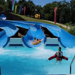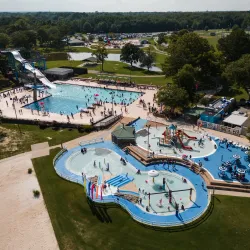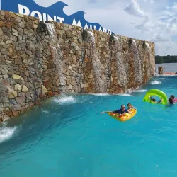 A large recreational park featuring water attractions, including a wave pool, water slides, and a lazy river, as well as golf courses, tennis courts, and picnic areas.