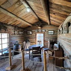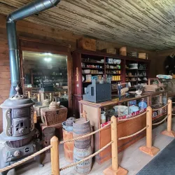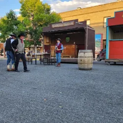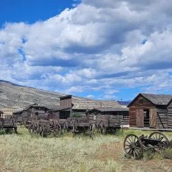 A collection of original and reconstructed Old West buildings and artifacts, including historic cabins, a saloon, and a blacksmith shop.
